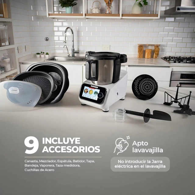 - 9 accesorios incluidos: Jarra, vaporera, canasta, mezclador, espátula, batidor y más