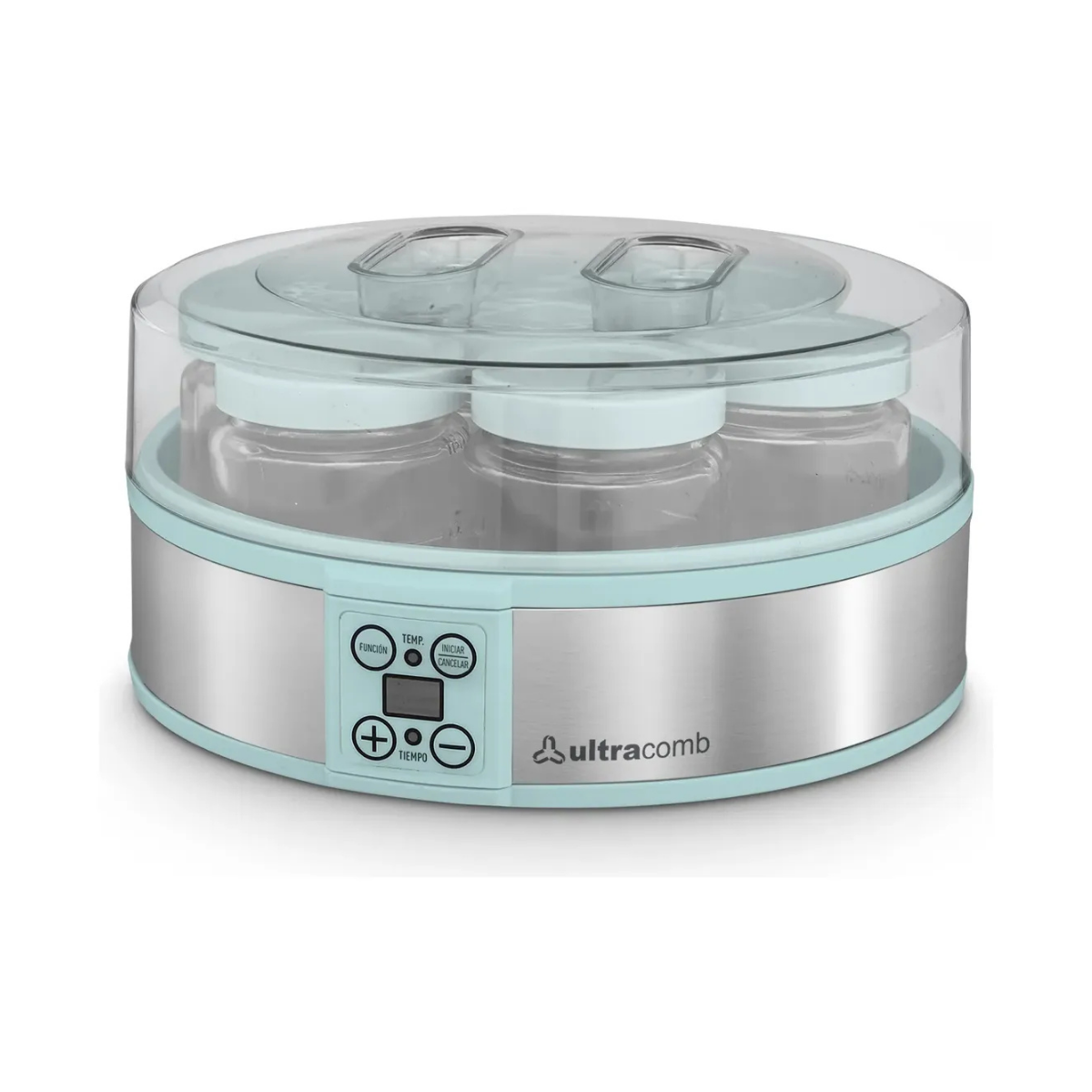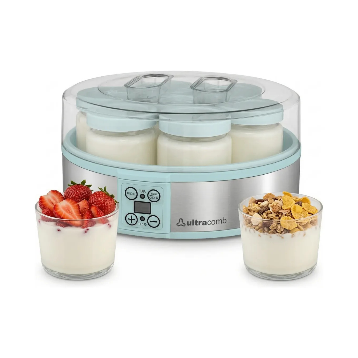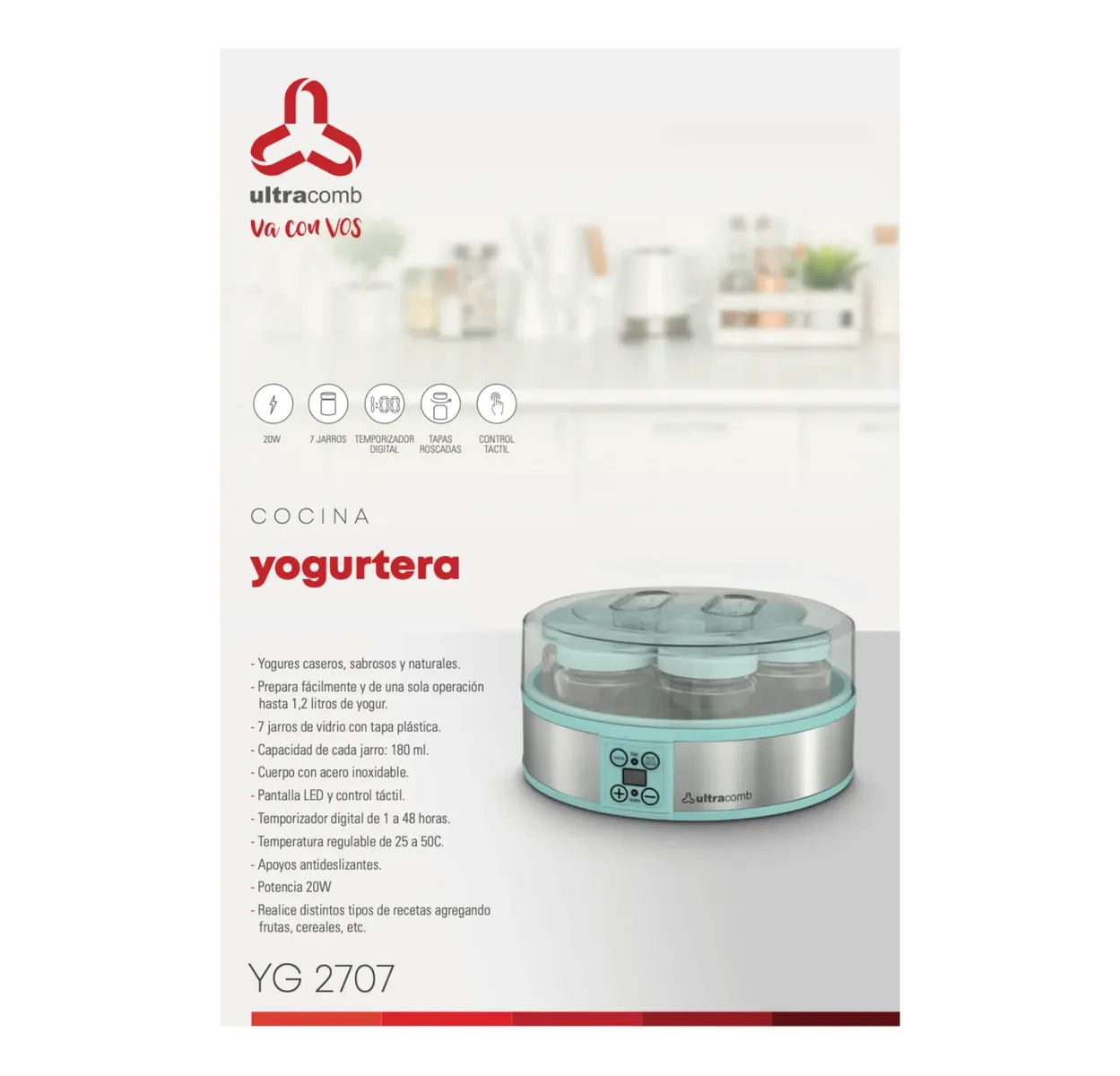 ¡Descubrí el placer de preparar tus propios yogures caseros, sabrosos y 100% naturales! Con la Yogurtera Digital Ultracomb YG-2707, cuidar tu alimentación y la de tu familia nunca fue tan fácil y delicioso. Olvidate de los conservantes y aditivos artificiales; ahora tenés el control total de lo que consumís, ahorrando dinero y ganando en salud. DISEÑO Y TECNOLOGÍA EN TU COCINA Diseñada para brindarte la mejor experiencia, esta yogurtera combina tecnología, elegancia y practicidad. Su sofisticado cuerpo con detalles en acero inoxidable le da un toque moderno que se adapta a cualquier ambiente. CARACTERÍSTICAS PRINCIPALES: - Capacidad Familiar: Prepará fácilmente y en una sola operación hasta 1,2 litros de yogur. ¡Ideal para tener siempre listo en la heladera! - Porciones Individuales: Incluye 7 jarros de vidrio de alta calidad con tapa plástica (180 ml cada uno), perfectos para conservar porciones exactas o llevar al trabajo y al colegio. - Precisión Digital: Equipada con una moderna pantalla LED y panel de control táctil. Podés programar el temporizador digital desde 1 hasta 48 horas y ajustar la temperatura exacta (entre 25°C y 50°C) para lograr la textura, cremosidad y acidez que más te guste. - Versatilidad sin límites: ¡Dejá volar tu imaginación! Disfrutá de desayunos y meriendas únicas creando distintos tipos de recetas: agregale frutas frescas, cereales, miel, mermeladas, frutos secos o chips de chocolate directamente en los frascos. - Segura y Eficiente: Cuenta con apoyos antideslizantes en la base para mayor firmeza en la mesada y funciona con una potencia de 20W, lo que garantiza un consumo eléctrico súper bajo. ESPECIFICACIONES TÉCNICAS: • Marca: Ultracomb • Modelo: YG-2707 • Potencia: 20W • Capacidad máxima: 1.2 Litros • Recipientes: 7 frascos de vidrio (180ml c/u) • Pantalla: LED Touch • Temporizador: 1 a 48 hs • Temperatura regulable: 25°C a 50°C • Base: Antideslizante • Material: Cuerpo con acero inoxidable ¡No esperes más para disfrutar del mejor yogur hecho en casa! Sumá salud, practicidad y el mejor sabor a tus días con Ultracomb.
